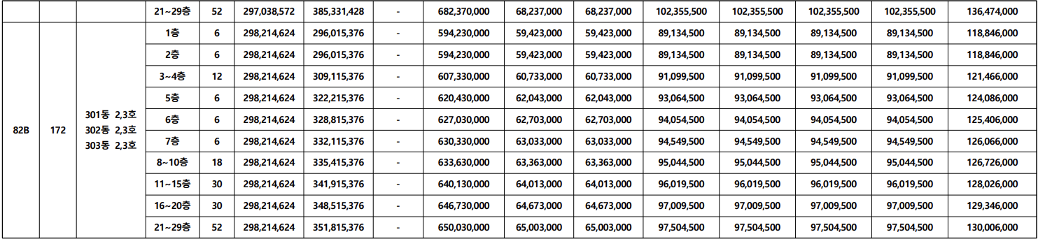 공급금액은 보시다시피 각 동, 층별로 분양가는 조금씩 차이가 나구요. 위로 올라갈 수록 가격은 조금 더 비싸집니다.